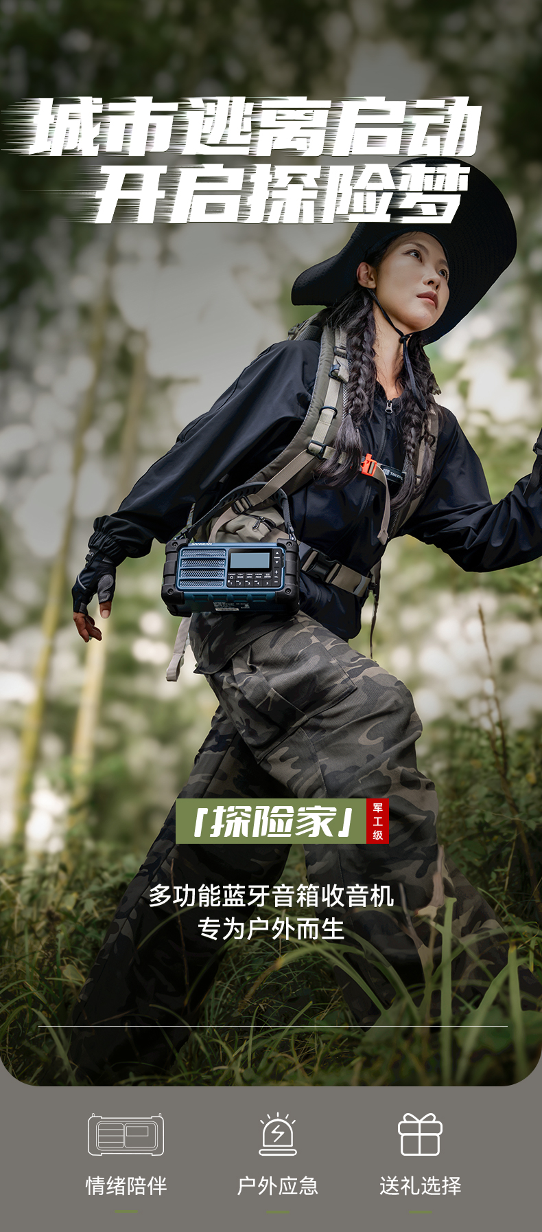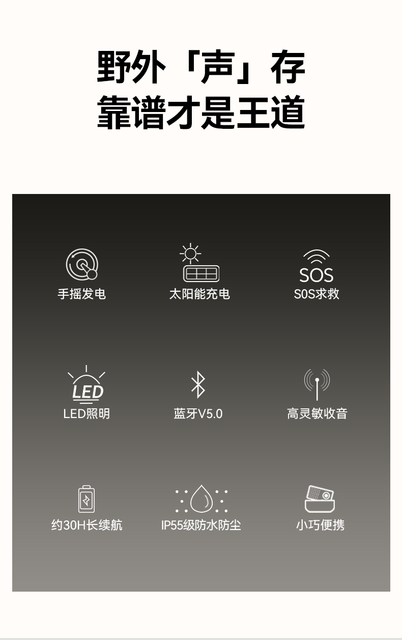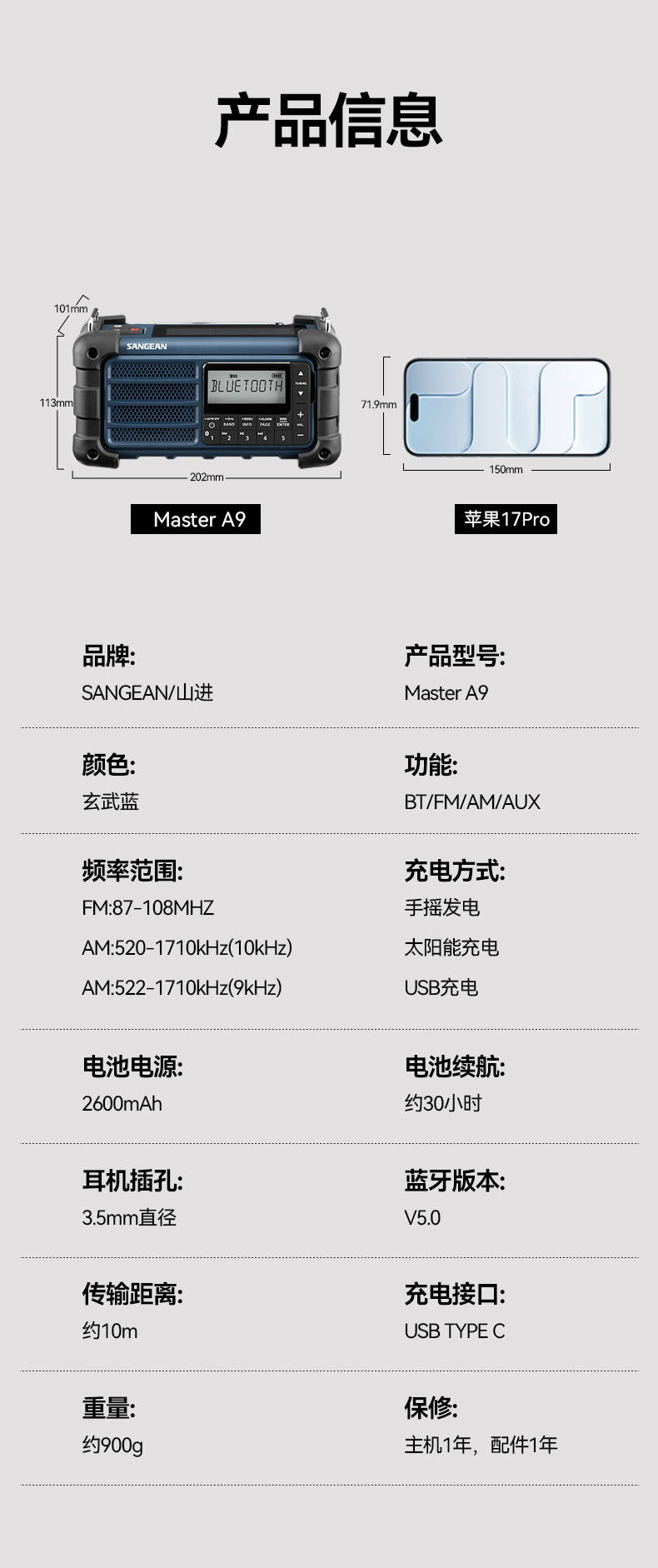 商品属性 型号 MASTER A9 传播名 探险家 功能 收音机蓝牙音箱 外壳材质 塑料 尺寸 20.2x11.3x10.1 cm 重量 约900g 附件 USB 连接线 x1, 背带 x1, 说明书 x1, 保证 卡 x1 。 保修 一年